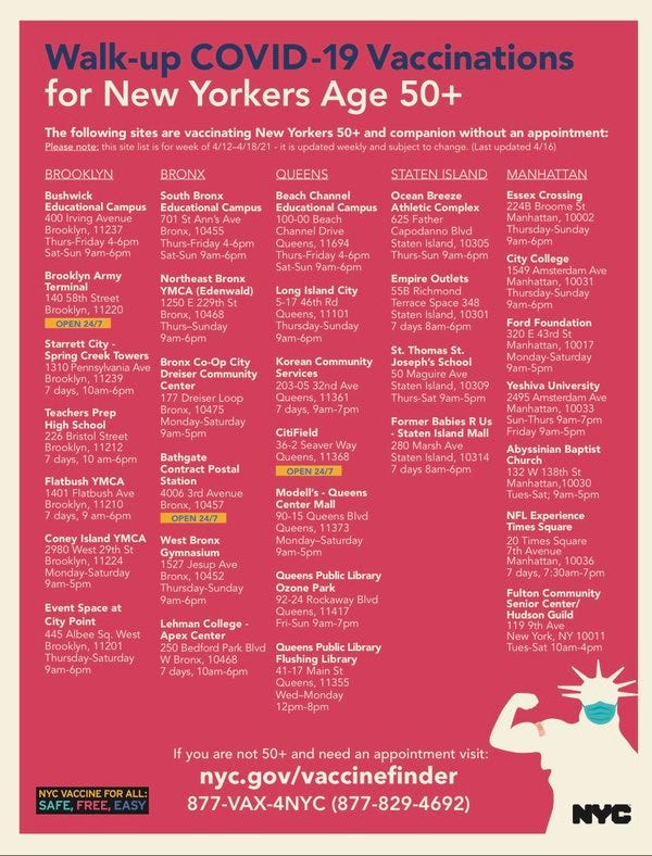 HT @nycshotslots These sites are expanding walk-ins to 50+ New Yorkers. A companion can also get vaccinated without an appointment.