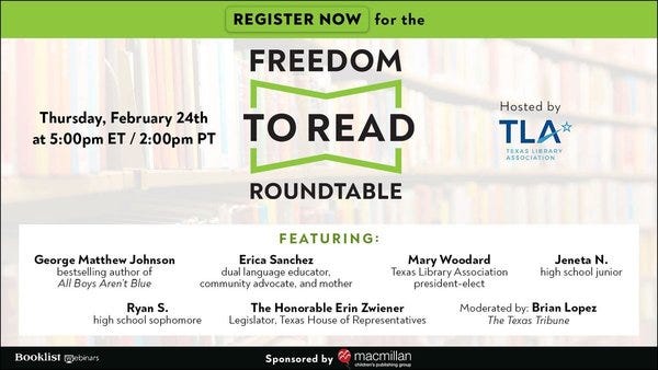 MT @ALALibrary Join the @TXLA on 2/24 for a crucial roundtable discussion of censorship and tangible steps to protect the freedom to read in this free @ALA_Booklist panel sponsored by @MacKidsSL. Attendees will also receive helpful resources and hear from @OIF.