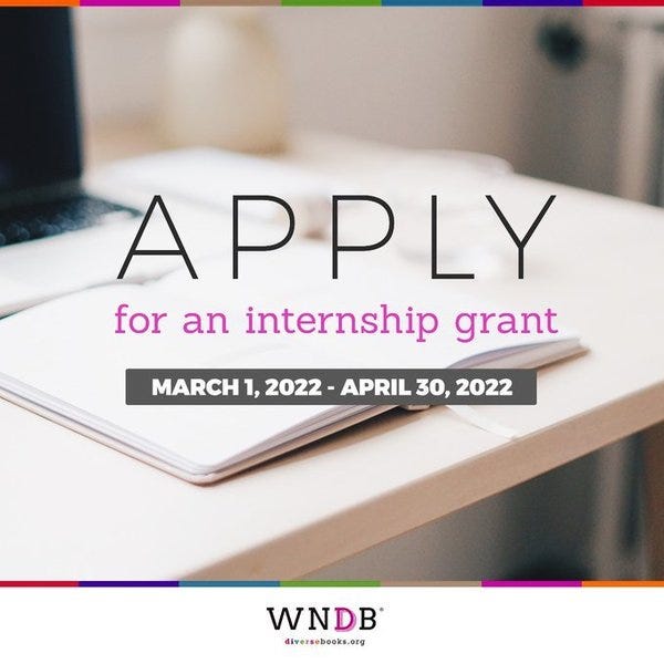 MT @diversebooks 🎊 The 2022 WNDB Internship Grant application is now OPEN! 🎊 Are you of a diverse background and looking to work in either children’s OR adult publishing? In our eighth program year, we continue to offer $3,000 grants for internships.