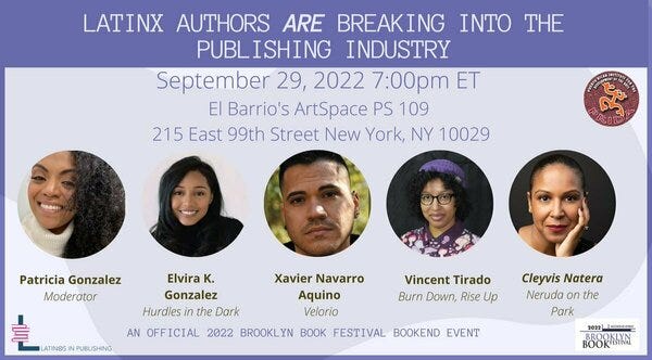 MT @LatinxinPub Don’t miss Latinx in Publishing’s Brooklyn Book Festival Bookend panel on September 29th at 7pm! #BKBF #BrooklynBookFestival#PRIDA #artspaceps109 #latinx