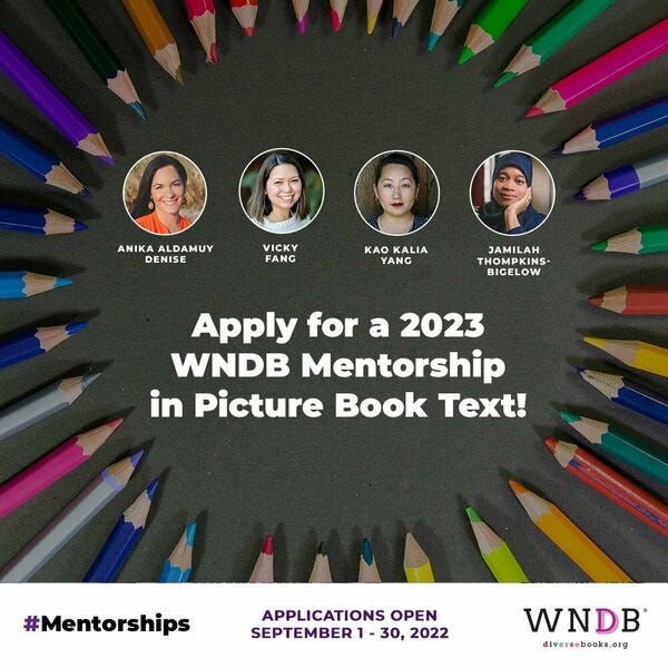 RT @diversebooks Apply for a 2023 WNDB Mentorship! We have four mentorships for picture book creators with @AnikaDenise, @fangmous, @kaokaliayang, & @jtbigelow. Diverse creators, here’s a chance to hone your craft and learn about the industry!