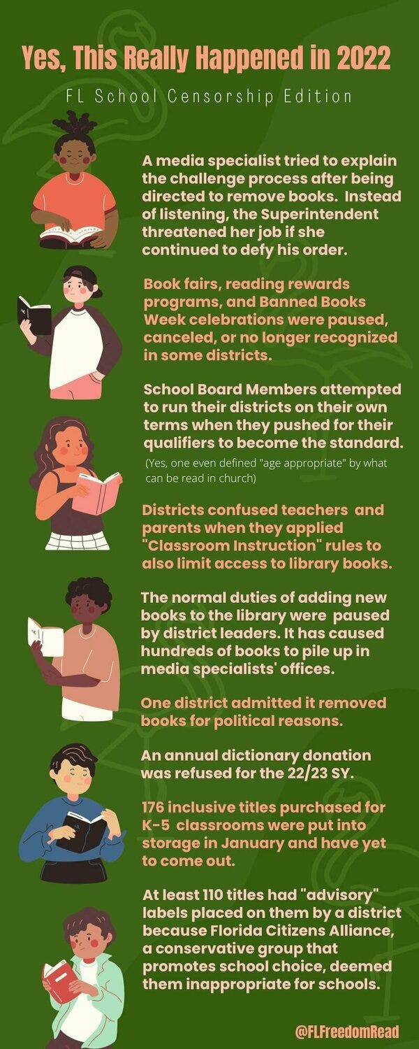 RT @FLFreedomRead We hope #BannedBooksWeek will bring more awareness to this era of censorship. For those new to the fight for the freedom to read here in FL, we put together a video to catch you up on the new #EdScare laws & special interest groups responsible.