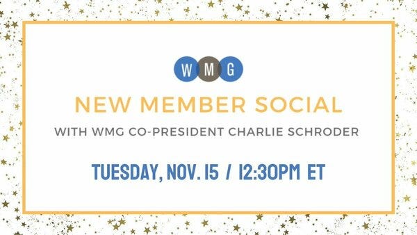 Are you a new member of @WMG_NYC? If you’ve joined WMG between November 2021 and now, join us next Tuesday, 11/15 at 12:30pm ET for a FREE, virtual New Member Social!