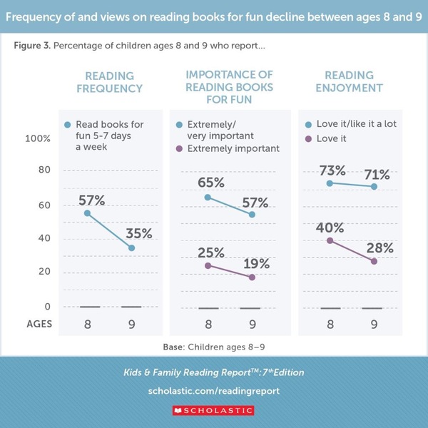 In our biennial Kids & Family Reading Report, we came across some findings that were a bit, well, concerning: At nine years old — usually when a child is in third grade — kids across the board report a significantly reduced interest in reading.