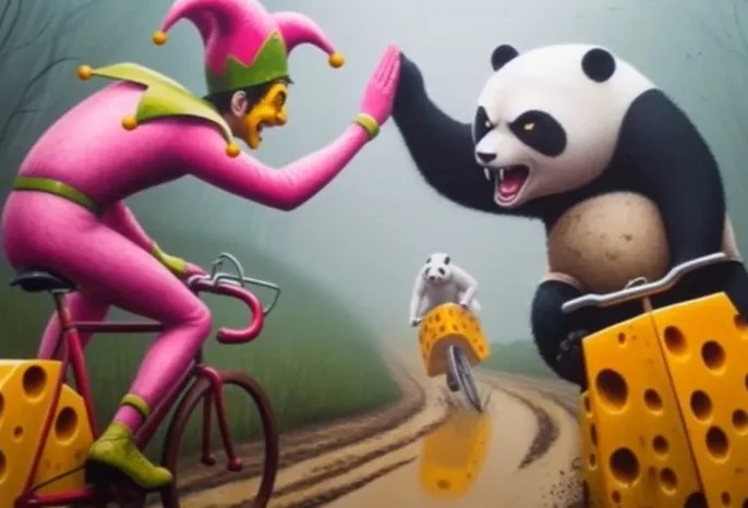 The prompt: A painting of a pink jester giving a high five to a panda while in a cycling competition. The bikes are made of cheese and the ground is very muddy. They are driving in a foggy forest. The panda is angry.